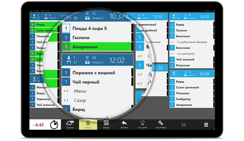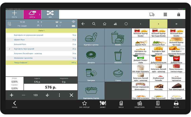 Интуитивный интерфейс iikoFront помогает кассирам оперативно оформлять заказы. Система выводит на экран рекомендации, позволяет легко разделять счет по гостям и работать с заказом на экране клиента.
