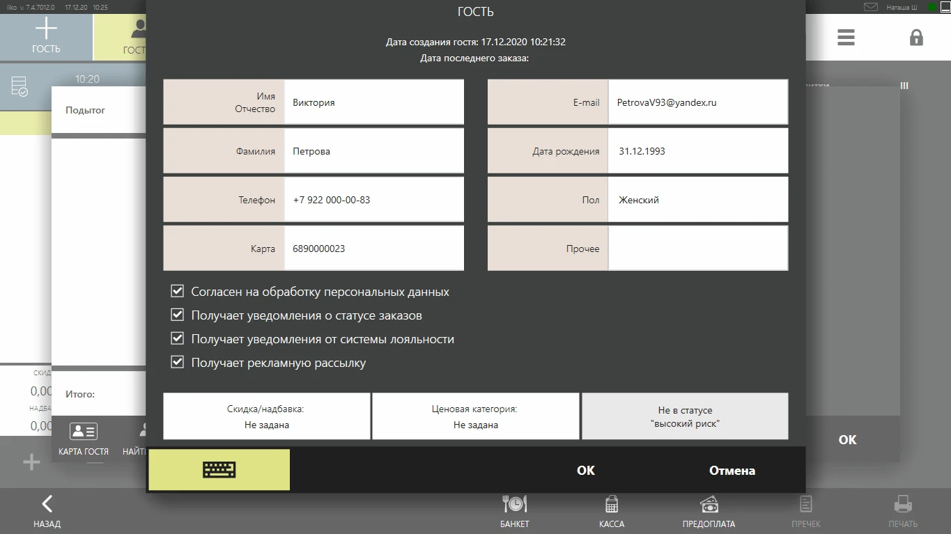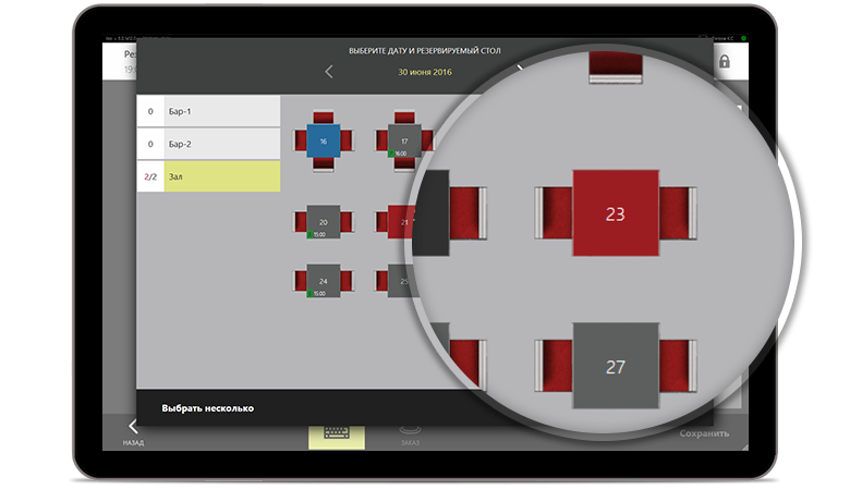 iikoFront автоматически ведет базы резервов и банкетов. Хостес вносит данные гостя и время брони прямо в систему – заявки из сайта или виджетов попадают в iiko без ручного ввода.