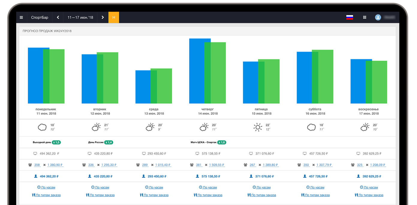 iiko анализирует историю продаж с учетом сезона, дня недели, погоды и других факторов. На основе этих данных система строит дневные и почасовые прогнозы выручки.