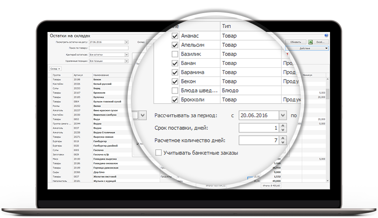 Используя прогноз продаж, iiko автоматически рассчитывает потребность в ингредиентах и формирует заказ поставщикам.