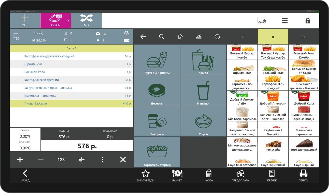 В момент заказа официант видит популярные комбо и актуальные акции в интерфейсе. Подсказки системы помогают предложить гостю доп.позиции и увеличить средний чек. -