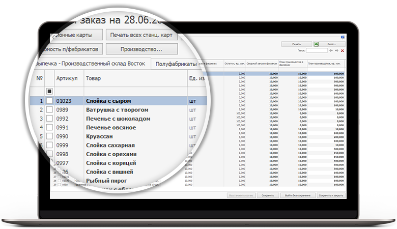 На основе плановых продаж программа вычисляет потребность в продуктах и самостоятельно отправляет заявку поставщику.Расписание загрузки кухни